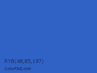 RYB 48,85,197 Color is a normal blue color and the nearest color is Mariner #286acd. Hex code #3061c5 and RGB value is rgb(48,97,197). In RGB color space, this color is composed of 19% red, 38% green, 77% blue, In CMYK color space, this color is composed of 76% cyan, 51% magenta, 0% yellow , 23% black , In HSL color space, this color has a hue angle of 220° , 61% saturation and 48% lightness.