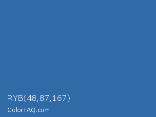 RYB 48,87,167 Color is a normal blue color and the nearest color is Azure #315ba1. Hex code #306aa7 and RGB value is rgb(48,106,167). In RGB color space, this color is composed of 19% red, 42% green, 65% blue, In CMYK color space, this color is composed of 71% cyan, 37% magenta, 0% yellow , 35% black , In HSL color space, this color has a hue angle of 211° , 55% saturation and 42% lightness.