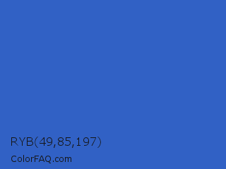 RYB 49,85,197 Color is a normal blue color and the nearest color is Mariner #286acd. Hex code #3161c5 and RGB value is rgb(49,97,197). In RGB color space, this color is composed of 19% red, 38% green, 77% blue, In CMYK color space, this color is composed of 75% cyan, 51% magenta, 0% yellow , 23% black , In HSL color space, this color has a hue angle of 221° , 60% saturation and 48% lightness.