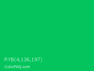 RYB 4,136,197 Color is a normal green color and the nearest color is Malachite #0bda51. Hex code #04c55d and RGB value is rgb(4,197,93). In RGB color space, this color is composed of 2% red, 77% green, 36% blue, In CMYK color space, this color is composed of 98% cyan, 0% magenta, 53% yellow , 23% black , In HSL color space, this color has a hue angle of 148° , 96% saturation and 39% lightness.
