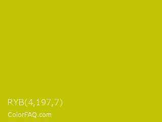 RYB 4,197,7 Color is a normal yellow color and the nearest color is Rio Grande #bbd009. Hex code #c2c504 and RGB value is rgb(194,197,4). In RGB color space, this color is composed of 76% red, 77% green, 2% blue, In CMYK color space, this color is composed of 2% cyan, 0% magenta, 98% yellow , 23% black , In HSL color space, this color has a hue angle of 61° , 96% saturation and 39% lightness.