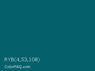 RYB 4,53,108 Color is a very dark cyan color and the nearest color is Mosque #036a6e. Hex code #04616c and RGB value is rgb(4,97,108). In RGB color space, this color is composed of 2% red, 38% green, 42% blue, In CMYK color space, this color is composed of 96% cyan, 10% magenta, 0% yellow , 58% black , In HSL color space, this color has a hue angle of 186° , 93% saturation and 22% lightness.