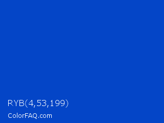 RYB 4,53,199 Color is a normal blue color and the nearest color is Absolute Zero #0048ba. Hex code #0445c7 and RGB value is rgb(4,69,199). In RGB color space, this color is composed of 2% red, 27% green, 78% blue, In CMYK color space, this color is composed of 98% cyan, 65% magenta, 0% yellow , 22% black , In HSL color space, this color has a hue angle of 220° , 96% saturation and 40% lightness.