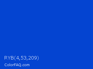 RYB 4,53,209 Color is a normal blue color and the nearest color is Absolute Zero #0048ba. Hex code #0444d1 and RGB value is rgb(4,68,209). In RGB color space, this color is composed of 2% red, 27% green, 82% blue, In CMYK color space, this color is composed of 98% cyan, 67% magenta, 0% yellow , 18% black , In HSL color space, this color has a hue angle of 221° , 96% saturation and 42% lightness.