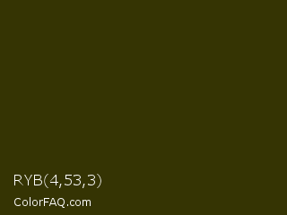 RYB 4,53,3 Color is a very dark yellow color and the nearest color is Madras #3f3002. Hex code #353403 and RGB value is rgb(53,52,3). In RGB color space, this color is composed of 21% red, 20% green, 1% blue, In CMYK color space, this color is composed of 0% cyan, 2% magenta, 94% yellow , 79% black , In HSL color space, this color has a hue angle of 59° , 89% saturation and 11% lightness.