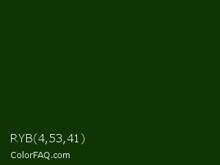 RYB 4,53,41 Color is a very dark green color and the nearest color is Deep Forest Green #182d09. Hex code #103504 and RGB value is rgb(16,53,4). In RGB color space, this color is composed of 6% red, 21% green, 2% blue, In CMYK color space, this color is composed of 70% cyan, 0% magenta, 92% yellow , 79% black , In HSL color space, this color has a hue angle of 105° , 86% saturation and 11% lightness.