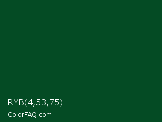 RYB 4,53,75 Color is a very dark green color and the nearest color is Kaitoke Green #004620. Hex code #044b24 and RGB value is rgb(4,75,36). In RGB color space, this color is composed of 2% red, 29% green, 14% blue, In CMYK color space, this color is composed of 95% cyan, 0% magenta, 52% yellow , 71% black , In HSL color space, this color has a hue angle of 147° , 90% saturation and 15% lightness.
