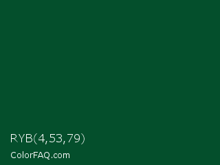 RYB 4,53,79 Color is a very dark green color and the nearest color is Sherwood Green #02402c. Hex code #044f2c and RGB value is rgb(4,79,44). In RGB color space, this color is composed of 2% red, 31% green, 17% blue, In CMYK color space, this color is composed of 95% cyan, 0% magenta, 44% yellow , 69% black , In HSL color space, this color has a hue angle of 152° , 90% saturation and 16% lightness.