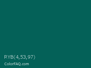 RYB 4,53,97 Color is a very dark cyan color and the nearest color is Deep Sea Green #095859. Hex code #046158 and RGB value is rgb(4,97,88). In RGB color space, this color is composed of 2% red, 38% green, 35% blue, In CMYK color space, this color is composed of 96% cyan, 0% magenta, 9% yellow , 62% black , In HSL color space, this color has a hue angle of 174° , 92% saturation and 20% lightness.