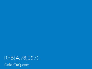 RYB 4,78,197 Color is a normal blue color and the nearest color is Lochmara #007ec7. Hex code #047cc5 and RGB value is rgb(4,124,197). In RGB color space, this color is composed of 2% red, 49% green, 77% blue, In CMYK color space, this color is composed of 98% cyan, 37% magenta, 0% yellow , 23% black , In HSL color space, this color has a hue angle of 203° , 96% saturation and 39% lightness.