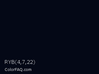 RYB 4,7,22 Color is a almost black blue color and the nearest color is Rich Black FOGRA29 #010b13. Hex code #040816 and RGB value is rgb(4,8,22). In RGB color space, this color is composed of 2% red, 3% green, 9% blue, In CMYK color space, this color is composed of 82% cyan, 64% magenta, 0% yellow , 91% black , In HSL color space, this color has a hue angle of 227° , 69% saturation and 5% lightness.