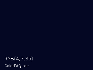RYB 4,7,35 Color is a almost black blue color and the nearest color is Deep Ebony #0c0b1d. Hex code #040723 and RGB value is rgb(4,7,35). In RGB color space, this color is composed of 2% red, 3% green, 14% blue, In CMYK color space, this color is composed of 89% cyan, 80% magenta, 0% yellow , 86% black , In HSL color space, this color has a hue angle of 234° , 79% saturation and 8% lightness.