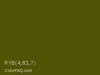 RYB 4,83,7 Color is a very dark yellow color and the nearest color is Verdun Green #495400. Hex code #505304 and RGB value is rgb(80,83,4). In RGB color space, this color is composed of 31% red, 33% green, 2% blue, In CMYK color space, this color is composed of 4% cyan, 0% magenta, 95% yellow , 67% black , In HSL color space, this color has a hue angle of 62° , 91% saturation and 17% lightness.