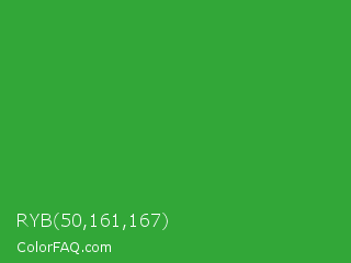RYB 50,161,167 Color is a normal green color and the nearest color is Wageningen Green #34b233. Hex code #32a738 and RGB value is rgb(50,167,56). In RGB color space, this color is composed of 20% red, 65% green, 22% blue, In CMYK color space, this color is composed of 70% cyan, 0% magenta, 66% yellow , 35% black , In HSL color space, this color has a hue angle of 123° , 54% saturation and 43% lightness.