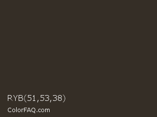 RYB 51,53,38 Color is a very dark orange color and the nearest color is Birch #373021. Hex code #352e26 and RGB value is rgb(53,46,38). In RGB color space, this color is composed of 21% red, 18% green, 15% blue, In CMYK color space, this color is composed of 0% cyan, 13% magenta, 28% yellow , 79% black , In HSL color space, this color has a hue angle of 32° , 16% saturation and 18% lightness.
