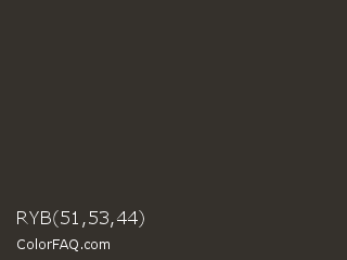 RYB 51,53,44 Color is a very dark orange color and the nearest color is Mine Shaft #323232. Hex code #35312c and RGB value is rgb(53,49,44). In RGB color space, this color is composed of 21% red, 19% green, 17% blue, In CMYK color space, this color is composed of 0% cyan, 8% magenta, 17% yellow , 79% black , In HSL color space, this color has a hue angle of 33° , 9% saturation and 19% lightness.