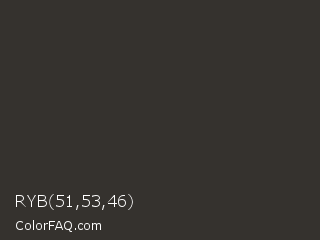 RYB 51,53,46 Color is a very dark orange color and the nearest color is Mine Shaft #323232. Hex code #35322e and RGB value is rgb(53,50,46). In RGB color space, this color is composed of 21% red, 20% green, 18% blue, In CMYK color space, this color is composed of 0% cyan, 6% magenta, 13% yellow , 79% black , In HSL color space, this color has a hue angle of 34° , 7% saturation and 19% lightness.