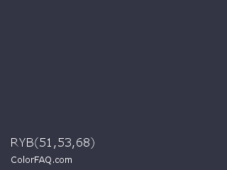 RYB 51,53,68 Color is a dark blue color and the nearest color is Tuna #353542. Hex code #333544 and RGB value is rgb(51,53,68). In RGB color space, this color is composed of 20% red, 21% green, 27% blue, In CMYK color space, this color is composed of 25% cyan, 22% magenta, 0% yellow , 73% black , In HSL color space, this color has a hue angle of 233° , 14% saturation and 23% lightness.