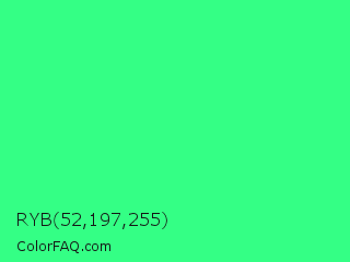 RYB 52,197,255 Color is a normal green color and the nearest color is UFO Green #3cd070. Hex code #34ff85 and RGB value is rgb(52,255,133). In RGB color space, this color is composed of 20% red, 100% green, 52% blue, In CMYK color space, this color is composed of 80% cyan, 0% magenta, 48% yellow , 0% black , In HSL color space, this color has a hue angle of 144° , 100% saturation and 60% lightness.