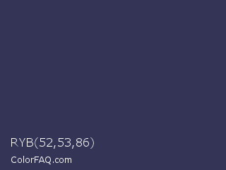 RYB 52,53,86 Color is a dark blue color and the nearest color is Martinique #363050. Hex code #343556 and RGB value is rgb(52,53,86). In RGB color space, this color is composed of 20% red, 21% green, 34% blue, In CMYK color space, this color is composed of 40% cyan, 38% magenta, 0% yellow , 66% black , In HSL color space, this color has a hue angle of 238° , 25% saturation and 27% lightness.