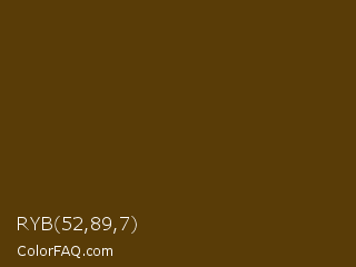 RYB 52,89,7 Color is a very dark orange color and the nearest color is Pineapple #563c0d. Hex code #593c07 and RGB value is rgb(89,60,7). In RGB color space, this color is composed of 35% red, 24% green, 3% blue, In CMYK color space, this color is composed of 0% cyan, 33% magenta, 92% yellow , 65% black , In HSL color space, this color has a hue angle of 39° , 85% saturation and 19% lightness.