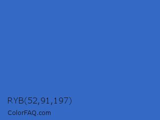 RYB 52,91,197 Color is a normal blue color and the nearest color is Mariner #286acd. Hex code #3469c5 and RGB value is rgb(52,105,197). In RGB color space, this color is composed of 20% red, 41% green, 77% blue, In CMYK color space, this color is composed of 74% cyan, 47% magenta, 0% yellow , 23% black , In HSL color space, this color has a hue angle of 218° , 58% saturation and 49% lightness.