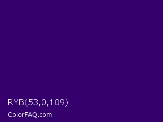 RYB 53,0,109 Color is a very dark violet color and the nearest color is Christalle #33036b. Hex code #35006d and RGB value is rgb(53,0,109). In RGB color space, this color is composed of 21% red, 0% green, 43% blue, In CMYK color space, this color is composed of 51% cyan, 100% magenta, 0% yellow , 57% black , In HSL color space, this color has a hue angle of 269° , 100% saturation and 21% lightness.