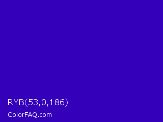 RYB 53,0,186 Color is a normal indigo color and the nearest color is Interdimensional Blue #360ccc. Hex code #3500ba and RGB value is rgb(53,0,186). In RGB color space, this color is composed of 21% red, 0% green, 73% blue, In CMYK color space, this color is composed of 72% cyan, 100% magenta, 0% yellow , 27% black , In HSL color space, this color has a hue angle of 257° , 100% saturation and 36% lightness.