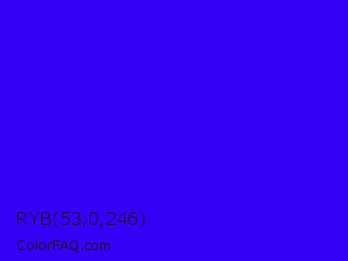 RYB 53,0,246 Color is a normal indigo color and the nearest color is Electric Ultramarine #3f00ff. Hex code #3500f6 and RGB value is rgb(53,0,246). In RGB color space, this color is composed of 21% red, 0% green, 96% blue, In CMYK color space, this color is composed of 78% cyan, 100% magenta, 0% yellow , 4% black , In HSL color space, this color has a hue angle of 253° , 100% saturation and 48% lightness.