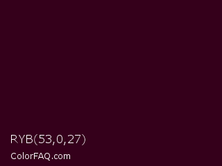 RYB 53,0,27 Color is a very dark rose color and the nearest color is Toledo #3a0020. Hex code #35001b and RGB value is rgb(53,0,27). In RGB color space, this color is composed of 21% red, 0% green, 11% blue, In CMYK color space, this color is composed of 0% cyan, 100% magenta, 49% yellow , 79% black , In HSL color space, this color has a hue angle of 329° , 100% saturation and 10% lightness.