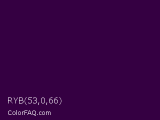 RYB 53,0,66 Color is a very dark purple color and the nearest color is Mardi Gras #350036. Hex code #350042 and RGB value is rgb(53,0,66). In RGB color space, this color is composed of 21% red, 0% green, 26% blue, In CMYK color space, this color is composed of 20% cyan, 100% magenta, 0% yellow , 74% black , In HSL color space, this color has a hue angle of 288° , 100% saturation and 13% lightness.
