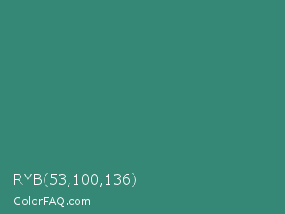 RYB 53,100,136 Color is a normal cyan color and the nearest color is Celadon Green #2f847c. Hex code #358875 and RGB value is rgb(53,136,117). In RGB color space, this color is composed of 21% red, 53% green, 46% blue, In CMYK color space, this color is composed of 61% cyan, 0% magenta, 14% yellow , 47% black , In HSL color space, this color has a hue angle of 166° , 44% saturation and 37% lightness.