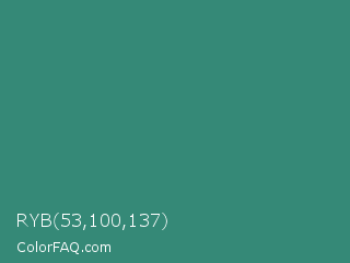 RYB 53,100,137 Color is a normal cyan color and the nearest color is Illuminating Emerald #319177. Hex code #358977 and RGB value is rgb(53,137,119). In RGB color space, this color is composed of 21% red, 54% green, 47% blue, In CMYK color space, this color is composed of 61% cyan, 0% magenta, 13% yellow , 46% black , In HSL color space, this color has a hue angle of 167° , 44% saturation and 37% lightness.