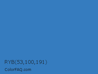 RYB 53,100,191 Color is a normal blue color and the nearest color is Cyan Blue Azure #4682bf. Hex code #357cbf and RGB value is rgb(53,124,191). In RGB color space, this color is composed of 21% red, 49% green, 75% blue, In CMYK color space, this color is composed of 72% cyan, 35% magenta, 0% yellow , 25% black , In HSL color space, this color has a hue angle of 209° , 57% saturation and 48% lightness.