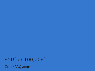 RYB 53,100,208 Color is a normal blue color and the nearest color is Han Blue #446ccf. Hex code #3578d0 and RGB value is rgb(53,120,208). In RGB color space, this color is composed of 21% red, 47% green, 82% blue, In CMYK color space, this color is composed of 75% cyan, 42% magenta, 0% yellow , 18% black , In HSL color space, this color has a hue angle of 214° , 62% saturation and 51% lightness.