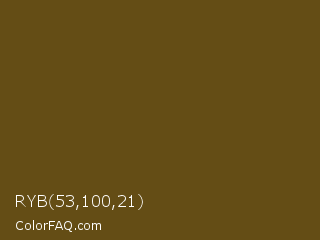RYB 53,100,21 Color is a dark orange color and the nearest color is West Coast #625119. Hex code #644d15 and RGB value is rgb(100,77,21). In RGB color space, this color is composed of 39% red, 30% green, 8% blue, In CMYK color space, this color is composed of 0% cyan, 23% magenta, 79% yellow , 61% black , In HSL color space, this color has a hue angle of 43° , 65% saturation and 24% lightness.