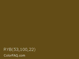 RYB 53,100,22 Color is a dark orange color and the nearest color is West Coast #625119. Hex code #644e16 and RGB value is rgb(100,78,22). In RGB color space, this color is composed of 39% red, 31% green, 9% blue, In CMYK color space, this color is composed of 0% cyan, 22% magenta, 78% yellow , 61% black , In HSL color space, this color has a hue angle of 43° , 64% saturation and 24% lightness.