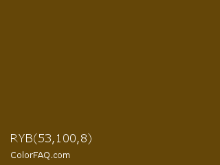 RYB 53,100,8 Color is a very dark orange color and the nearest color is Cafe Royale #6f440c. Hex code #644608 and RGB value is rgb(100,70,8). In RGB color space, this color is composed of 39% red, 27% green, 3% blue, In CMYK color space, this color is composed of 0% cyan, 30% magenta, 92% yellow , 61% black , In HSL color space, this color has a hue angle of 40° , 85% saturation and 21% lightness.