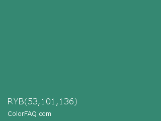 RYB 53,101,136 Color is a normal cyan color and the nearest color is Illuminating Emerald #319177. Hex code #358872 and RGB value is rgb(53,136,114). In RGB color space, this color is composed of 21% red, 53% green, 45% blue, In CMYK color space, this color is composed of 61% cyan, 0% magenta, 16% yellow , 47% black , In HSL color space, this color has a hue angle of 164° , 44% saturation and 37% lightness.