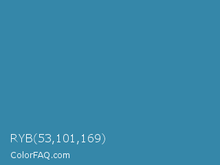 RYB 53,101,169 Color is a normal blue color and the nearest color is Astral #327da0. Hex code #3587a9 and RGB value is rgb(53,135,169). In RGB color space, this color is composed of 21% red, 53% green, 66% blue, In CMYK color space, this color is composed of 69% cyan, 20% magenta, 0% yellow , 34% black , In HSL color space, this color has a hue angle of 198° , 52% saturation and 44% lightness.