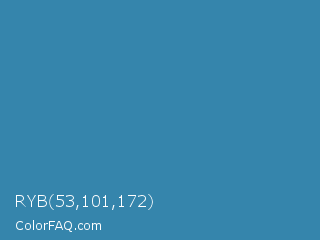 RYB 53,101,172 Color is a normal blue color and the nearest color is Astral #327da0. Hex code #3585ac and RGB value is rgb(53,133,172). In RGB color space, this color is composed of 21% red, 52% green, 67% blue, In CMYK color space, this color is composed of 69% cyan, 23% magenta, 0% yellow , 33% black , In HSL color space, this color has a hue angle of 200° , 53% saturation and 44% lightness.