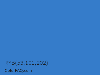 RYB 53,101,202 Color is a normal blue color and the nearest color is Cyan Blue Azure #4682bf. Hex code #357cca and RGB value is rgb(53,124,202). In RGB color space, this color is composed of 21% red, 49% green, 79% blue, In CMYK color space, this color is composed of 74% cyan, 39% magenta, 0% yellow , 21% black , In HSL color space, this color has a hue angle of 211° , 58% saturation and 50% lightness.