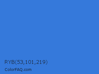 RYB 53,101,219 Color is a normal blue color and the nearest color is Royal Blue #4169e1. Hex code #3579db and RGB value is rgb(53,121,219). In RGB color space, this color is composed of 21% red, 47% green, 86% blue, In CMYK color space, this color is composed of 76% cyan, 45% magenta, 0% yellow , 14% black , In HSL color space, this color has a hue angle of 215° , 70% saturation and 53% lightness.