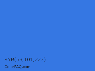 RYB 53,101,227 Color is a normal blue color and the nearest color is Royal Blue #4169e1. Hex code #3577e3 and RGB value is rgb(53,119,227). In RGB color space, this color is composed of 21% red, 47% green, 89% blue, In CMYK color space, this color is composed of 77% cyan, 48% magenta, 0% yellow , 11% black , In HSL color space, this color has a hue angle of 217° , 76% saturation and 55% lightness.