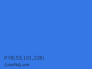 RYB 53,101,228 Color is a normal blue color and the nearest color is Royal Blue #4169e1. Hex code #3577e4 and RGB value is rgb(53,119,228). In RGB color space, this color is composed of 21% red, 47% green, 89% blue, In CMYK color space, this color is composed of 77% cyan, 48% magenta, 0% yellow , 11% black , In HSL color space, this color has a hue angle of 217° , 76% saturation and 55% lightness.