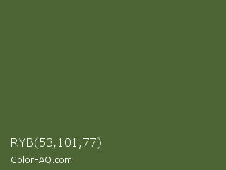 RYB 53,101,77 Color is a dark green color and the nearest color is Dark Olive Green #556b2f. Hex code #4d6535 and RGB value is rgb(77,101,53). In RGB color space, this color is composed of 30% red, 40% green, 21% blue, In CMYK color space, this color is composed of 24% cyan, 0% magenta, 48% yellow , 60% black , In HSL color space, this color has a hue angle of 90° , 31% saturation and 30% lightness.