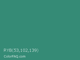 RYB 53,102,139 Color is a normal cyan color and the nearest color is Illuminating Emerald #319177. Hex code #358b76 and RGB value is rgb(53,139,118). In RGB color space, this color is composed of 21% red, 55% green, 46% blue, In CMYK color space, this color is composed of 62% cyan, 0% magenta, 15% yellow , 45% black , In HSL color space, this color has a hue angle of 165° , 45% saturation and 38% lightness.