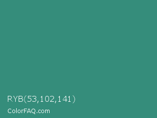 RYB 53,102,141 Color is a normal cyan color and the nearest color is Illuminating Emerald #319177. Hex code #358d7b and RGB value is rgb(53,141,123). In RGB color space, this color is composed of 21% red, 55% green, 48% blue, In CMYK color space, this color is composed of 62% cyan, 0% magenta, 13% yellow , 45% black , In HSL color space, this color has a hue angle of 168° , 45% saturation and 38% lightness.