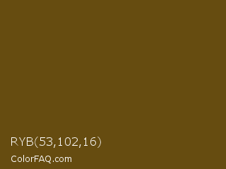 RYB 53,102,16 Color is a dark orange color and the nearest color is Horses Neck #604913. Hex code #664c10 and RGB value is rgb(102,76,16). In RGB color space, this color is composed of 40% red, 30% green, 6% blue, In CMYK color space, this color is composed of 0% cyan, 25% magenta, 84% yellow , 60% black , In HSL color space, this color has a hue angle of 42° , 73% saturation and 23% lightness.