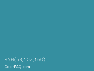 RYB 53,102,160 Color is a normal cyan color and the nearest color is Astral #327da0. Hex code #358fa0 and RGB value is rgb(53,143,160). In RGB color space, this color is composed of 21% red, 56% green, 63% blue, In CMYK color space, this color is composed of 67% cyan, 11% magenta, 0% yellow , 37% black , In HSL color space, this color has a hue angle of 190° , 50% saturation and 42% lightness.